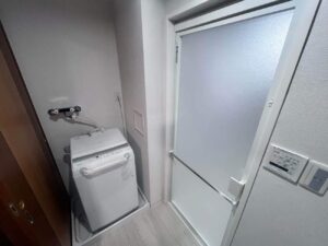 洗面室は洗濯機パンと洗濯機水栓、分電盤も交換しました。分電盤は洗面化粧台に当たらない様に、メーカーに寸法を何度も確認して選定しました。