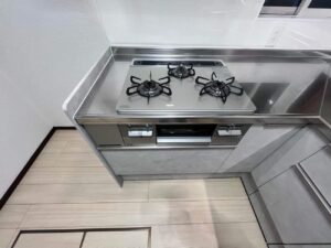 レンジフードはお掃除し易い、フラットASRタイプで、ガスコンロも無水両面焼グリルのファイントップ、水栓金具はシャワー節湯水栓を採用しましたので、断熱サッシと合わせて、子育てグリーン住宅補助金に該当します。