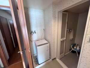 この場合は同じサイズでリフォームする場合は、浴室のドア枠か洗面室のドア枠のどちらかを壊さないと収まりません。