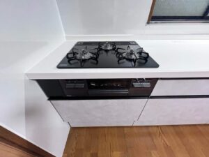 ガスコンロは、3口ガラストップ 無水両面焼グリルW600 ブラックを設置、レンジフードはASRシロッコファンW900 シルバーを採用、フラットで見た目もスッキリ、お掃除もし易くなりました~(^O^)/